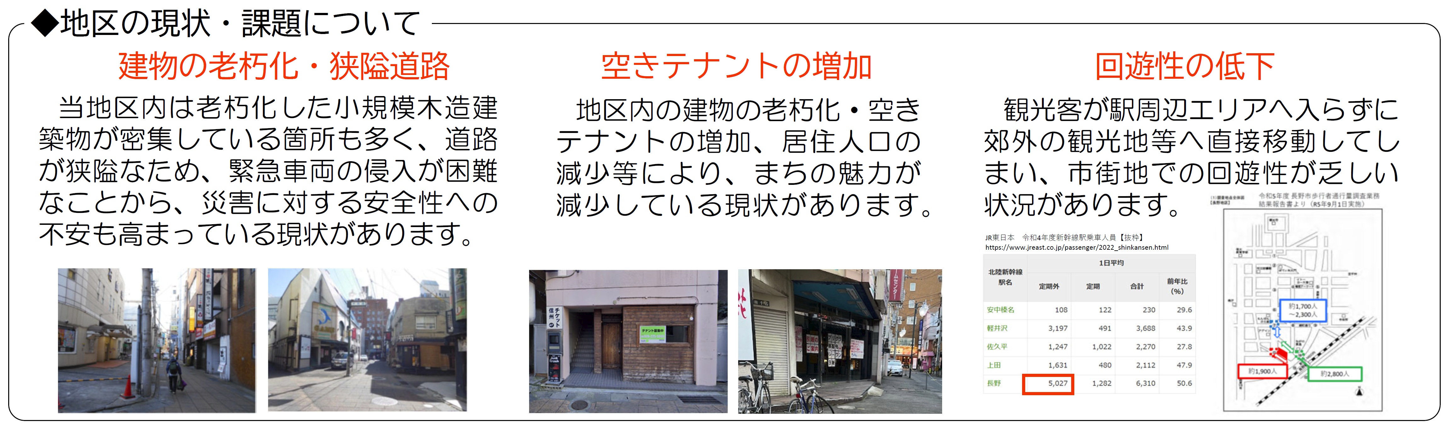 また、建物の老朽化が著しく、地区内道路も狭隘であるため安全面・防災面の改善が求められる状況です。本事業による土地利用の共同化及び高度利用により、商業・観光機能の拡充とまちなか居住を促進する施設整備を行い、長野駅前・善光寺表参道入口としての区域の「顔」づくり、賑わいの創出、安全・安心なまちづくりを行うものです。