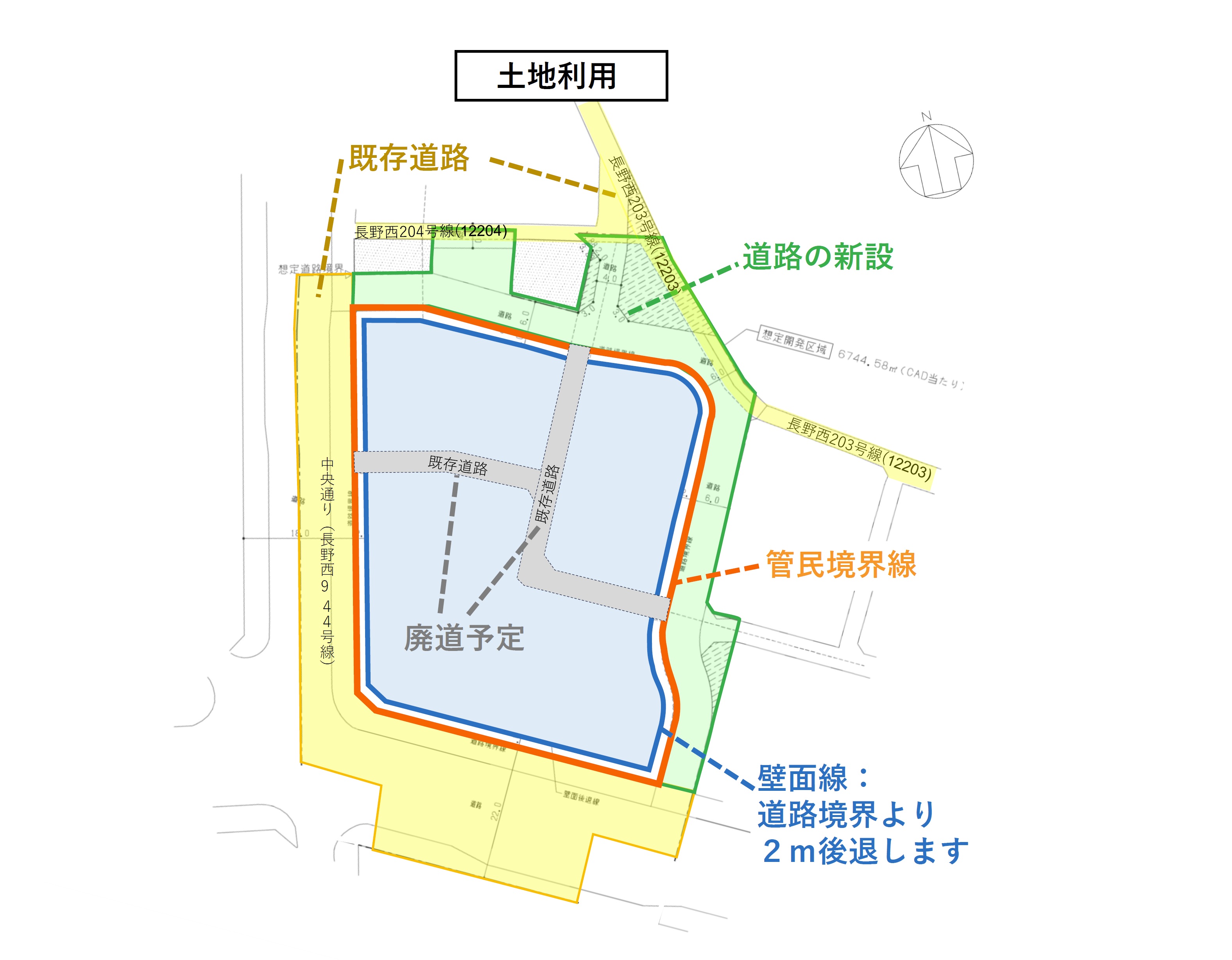 なお、従前の敷地内道路(グレー網掛け部分)は新設の外周道路(緑網掛け部分)に付替えのうえ、一部拡幅となります。